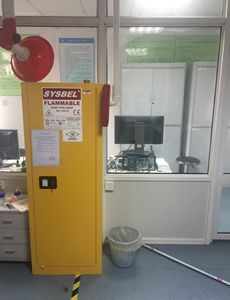 SYSBEL高品质易燃液体安全柜由双层18 Ga(1.2-mm)钢板通过点焊接构造,两层之间相隔38mm的形成良好的防火绝缘层; 左右两侧设置通风装置有效降低挥发性物质浓度,预防火灾产生; 树脂粉末涂料处理,表面光亮,防尘,防锈和防潮; SYSTEX三点联动锁减少摩擦或机械火花,降低静电积蓄; 安全挂锁配置(选配),实现双人双锁管理,符合中国《危险化学品安全管理条例》的规定; 2"(53mm)深的盛漏槽防止泄漏的液体外溢,符合盛漏规范; 独有的防溢式层板防止意外泄漏的化学品四溢,层板可以依据用户需求任意调节,增加空间使用率,每隔6.5cm; 用户可以选择安装FM认证的防静电装置(单售),将静电荷导入大地,降低静电火花造成火灾风险; 连续的琴式铰链使得柜门平稳闭合开启; 醒目的标签可以在能见度较低的光线下辨识,提供了额外的安全保障; 细节展示
