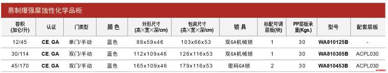 易制爆强腐蚀性化学品柜基于标准安全柜设计,具有同安全柜同样的防火、通风等特点;易制爆强腐蚀性化学品柜内部采用耐腐蚀 PP板拼接而成,具有耐强酸、强碱与抗腐蚀的优异特性;PP层板整体设计为活动式,可根据用户需要放置在合适的隔层,满足用户 多样化的选择;采用电子密码锁+机械锁双锁管控,提高设备安全性;采用GA认证的电子密码锁,有效做到危化品的管控、安全、 防盗、防误撞,符合行业标准GA1511-2018。