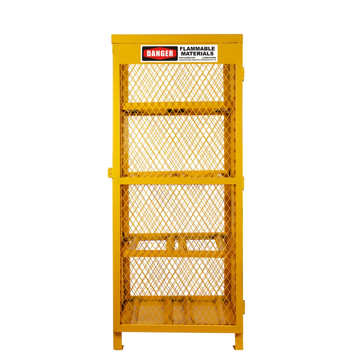 气瓶柜整个结构由钢板底座和顶盖,网状周围组成,起到通风的作用; 如需要,可以在空载状态下搬运柜体; 压缩气瓶柜配置可调节的链条,用于保护气瓶处于竖直状态; 设置双锁结构,保证未经许可的人员进入;(挂锁不提供) 底部撑预留孔位,便于与地面安装固定;(安装五金件不提供) 气瓶柜磁吸门结构维持柜门处于关闭状态; 表面选用具有警示作用的黄色喷涂,具有一定的耐腐蚀性,可用于室外; 柜体标识“危险 易燃 物品”字样; 拼装设计降低运输成本;