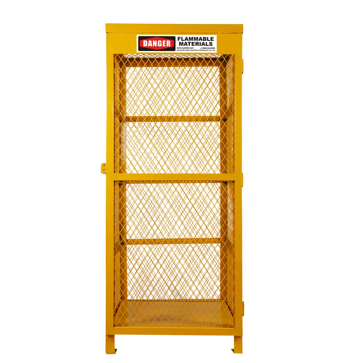 气瓶柜整个结构由钢板底座和顶盖,网状周围组成,起到通风的作用; 如需要,可以在空载状态下搬运柜体; 压缩气瓶柜配置可调节的链条,用于保护气瓶处于竖直状态; 设置双锁结构,保证未经许可的人员进入;(挂锁不提供) 底部撑预留孔位,便于与地面安装固定;(安装五金件不提供) 磁吸门结构维持柜门处于关闭状态; 气瓶柜表面选用具有警示作用的黄色喷涂,具有一定的耐腐蚀性,可用于室外; 柜体标识“危险 易燃 物品”字样; 拼装设计降低运输成本;