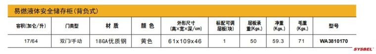 SYSBEL背负式防火安全柜设计不占用空间,设计安装在顶部的30和45加仑(114和170升),它们也可以独立地用作台式柜或堆叠以提供额外的存储。也可通过订购壁挂器组件将其转换成壁挂柜。此安全柜是我们的经典防火柜的特点和优势 通过将易燃燃料和化学品储存在符合规范的安全柜中,保护工人,减少火灾风险,并提高生产率。为满足OSHA和NFPA标准,Real-Relp®EX机箱由坚固的18规格(1.2mm)厚双壁焊接钢制成,双层钢板中间为(38 mm)的隔热空气空间,用于耐火性。高性能在火灾条件下容易和安全地****地保护。 警戒反射警告标签在火灾条件下或在用手电筒照明时断电时是高度可见的。柜子还具有双通风口与火焰阻隔器,接地导线,警告标签。