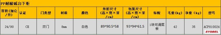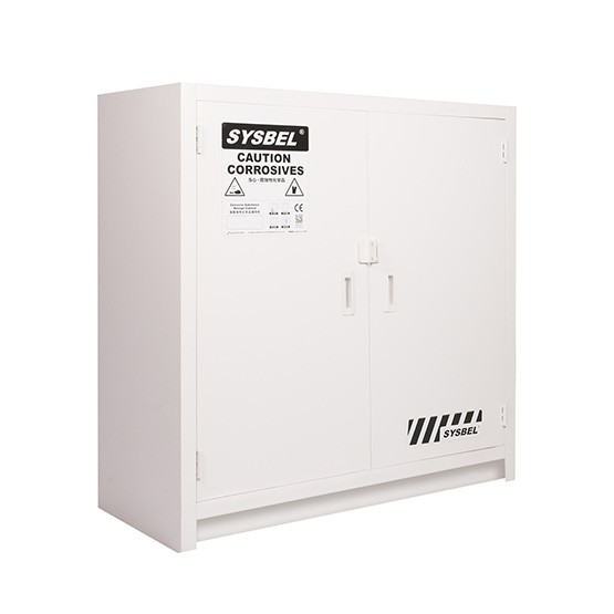 SYSBEL生产的双门PP台下存储柜采用8mm 厚的耐腐蚀PP板拼接而成,柜体结构稳固且耐用,存储柜底部踢脚、通风孔设计,可配置在实验台、通风柜台下使用,用于存放各种药品及绝大多数腐蚀性化学物质,广泛应用于科研院所、高校、企业等实验室。PP台下柜可以规范管理,有条理,分类存储不同性质及危险等级的化学品,有效防止及减少身伤害。 1、采用8mm 厚PP 板材,经过同色同质焊条焊接而成,具有耐强酸,强碱与抗腐蚀的优异特性; 2、柜子底部踢脚设计,符合人体工程学,方便试验人员日常作业。 3、层板可调节且正反放置均可,满足用户多样化的选择(矮立边向上为正放,承重好,矮立边向下为反放,承重能力次之); 4、板材折弯成型,拼接后的柜体结构稳定,防止变形; 5、全塑料内嵌式门把手和铰链的设计使得柜子整体防腐蚀; 6、柜体设置通风孔,可外接通风系统; 7、安全挂锁配置,实现双人双锁管理,符合中国《危险化学品安全管理条例》(2011 年12 月1 日版)的规定。