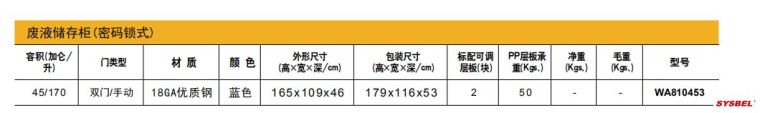 1.密码锁废液柜基于标准安全柜设计,具有同安全柜同样的防火、通风等特点。 2.密码锁安全柜内部采用耐腐蚀PP板拼接而成,具有耐强酸、强碱与抗腐蚀的优异特性。; 3.PP层板整体设计为活动式,可根据用户需要放置在合适的隔层,满足用户多样化的选择; 4.柜内可放置市面上常规的6L、10L、20L等型号的废液桶; 5.密码锁废液柜采用电子密码锁+机械锁双锁管控,提高设备安全性; 6.采用GA认证的电子密码锁,有效做到危化品的管控、安全、防盗、防误撞; 7.防盗报警装置,连续三次输入错误密码或柜体受到剧烈震动时会产生蜂鸣声60秒,可通过输入正确密码开锁,解除报警。 8.电子密码锁面板采用液晶显示,显示年月日、时间、星期、电池电量等信息。 9.电子密码锁可根据用户需求任意设置1-8位密码。 10.电子密码锁可查询14次开门记录。