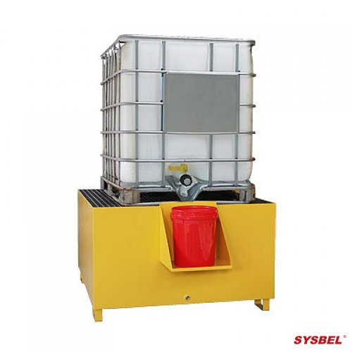 用于存放装有油品,溶剂,易燃液体的IBC中型散装容器; 由3mm热轧钢板制成,结构稳固耐用; 托盘主体环氧树脂粉末涂料处理,表面光亮,防尘,防锈和防潮; 具有质量轻,强度高,耐磨损,抗老化等特性的钢制格栅取出清洁; 较大盛漏量的设计遵照盛漏规范,且经过100%的盛漏测试; 满足各类叉车的搬运,可四面进叉,操作更加便利; 侧壁可放置小油桶支架(单售),降低油品等化学品转运时造成的泄漏损失; 托盘中心放置的圆筒支架分散载重,性能更加牢固; 标配3/4"NPT(六分)的球阀配件安装在排漏孔实现泄漏液体的转移,操作便捷; 用户可选择拆除底部设有的堵头彻底释放盛漏液体以及清洗托盘。