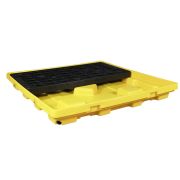 用于存放装有油品,溶剂,易燃液体的55加仑油桶; 由3mm热轧钢板制成,结构稳固耐用; 托盘主体环氧树脂粉末涂料处理,表面光亮,防尘,防锈和防潮; 具有质量轻,强度高,耐磨损,抗老化等特性的钢制格栅可取出清洁; 满足各类叉车的搬运,可两面进叉,操作更加便利; 较大盛漏量的设计遵照盛漏规范,且经过100%的盛漏测试; 托盘中心放置的圆筒支架分散载重,性能更加牢固; 标配3/4"NPT(六分)的球阀配件安装在排漏孔实现泄漏液体的转移,操作便捷; 用户可选择拆除底部设有的堵头彻底释放盛漏液体以及清洗托盘。