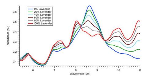 Ocean MZ5测量了用杏仁油(一种普通掺释物)稀释的薰衣草油样品的一系列吸收光谱,光谱差异揭示了浓度相关差异。光谱数据再使用化学计量分析可以获得更多额外信息。 应用