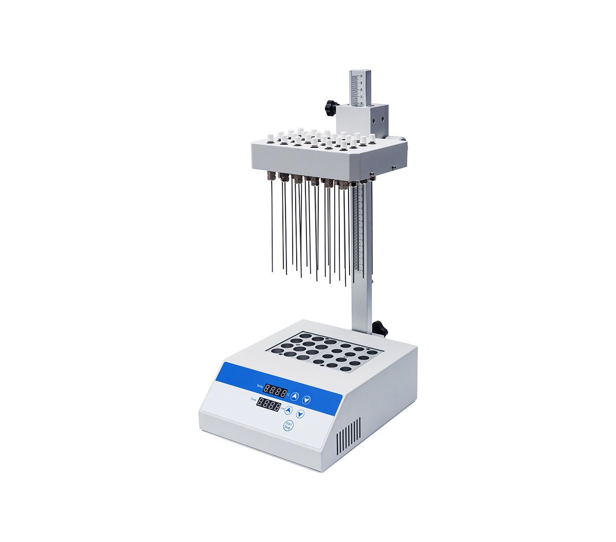 产品特点 1.气针相互独立,不会引起交叉感染; 2.每个气针气体流量大小可单独调节; 3.各吹管通道可组合使用或单独使用; 4.每个气针流量调控阀和模块孔位垂直对应,调整直观、方便; 5.系统控温精度高、控温范围广、温度校准方便; 6.升降机构有阻尼防滑装置和紧固螺丝双重保护,使用更安全; 7.升降机构带刻度显示,定位准确明了,提升批次间的数据均一性。 描述 DC150 氮吹仪系列是采用 PID 控温金属浴和氮气吹扫装置结合而成的多通道样品浓缩装置,其工作原理是将氮气快速、连续、可控地吹到加热样品表面,根据被浓缩样品的溶剂蒸发速度和沸点,设定加热温度,实现批量样品的快速浓缩。本仪器采用铝加热模块,其传热性好、传热均匀,这利于快速加热和快速温控。将氮气吹到样品表面,实现液体样品的无氧浓度。 技术参数