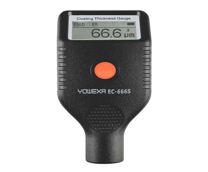 产品特点 ● 双原理一体,红宝石探头 ● 带蓝牙及手机APP ● 分辨率0.1μm,精度±(2%+1μm),量程2000μm ● 显示最大、最小、平均值和个数 ● 显示界面回查10个测量值 ● 最大测量速度2次/秒 ● 一个按键,操作简单 【产品描述】 EC-666系列测厚仪可无损测量金属表面非导电覆层,以及铁磁性金属(如铁、镍和钴等)表面非铁磁性金属覆层的厚度,具体用途包括测量铁、不锈钢表面油漆或镀锌层的厚度,测量铝、铜表面油漆或塑料薄膜的厚度等。 EC-666内置磁感应和涡流效应一体探头,具有0~2000μm的测量范围及±(3%+1μm)的测量精度,其分辨率最高可达0.1μm。 EC-666仅有一个按键,操作非常简单。测量时,用户只需将探头端快速贴合被测物表面,在探头往仪器内部收缩的过程中,仪器便可自动分辨基材属性并测量出涂(镀)层的厚度。此外,仪器内含大容量存储器。在测量过程中,仪器自动统计并记录测量结果。记录下来的数据,随时可通过USB数据线传送至电脑。 EC-666S在EC-666的基础上,升级了探头,提高了精度,增加了功能。相比EC-666,EC-666S的抗干扰能力更强,可在更复杂的电磁场环境中工作。EC-666S的精度为±(2%+1μm),其测量结果还可由蓝牙实时发送至手机APP。 EC-666E和 EC-666SE分别为EC-666和EC-666S的外置探头版本机型,其探头线长约为1米。相比内置探头机型,外置探头机型更适合在狭小空间或流水线作业。 【应用领域】 本仪器能无损、快速、精密地进行涂、镀层厚度的测量。它广泛应用在汽车油漆厚度检测、船舶制造、电镀、金属防锈处理、薄膜厚度检测、五金零件加工等检测领域。 【技术参数】