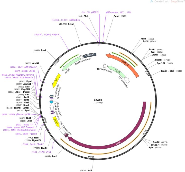 质粒名称:bRA89 质粒编号:100950 质粒备注: (Empty Backbone) Cas9 driven by PGK1 promoter. gRNA can be cloned into the BplI sites. HPH marker 载体名称:pRS316 载体类型:Yeast Expression, CRISPR, Synthetic Biology 筛选标记:潮霉素 原核抗性:氨苄青霉素,100μg/mL 培养温度:37℃ 克隆菌株:DH5alpha 高拷贝/低拷贝:高拷贝 插入基因:None 质粒图谱: