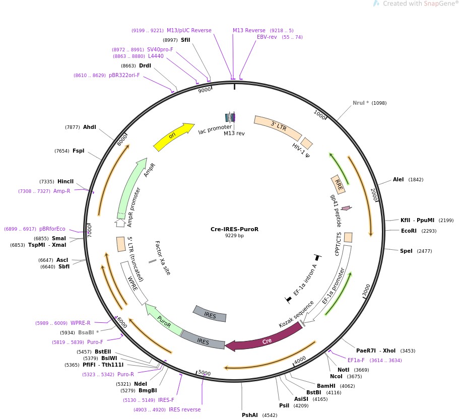 质粒名称:Cre-IRES-PuroR 质粒编号:30205 载体名称:pHAGE2 载体大小:8164 载体类型:哺乳动物表达,慢病毒 筛选标记:嘌呤霉素 原核抗性:氨苄青霉素,100μg/mL 培养温度:37℃ 克隆菌株:NEB Stable 高拷贝/低拷贝:高拷贝 插入基因:Cre recombinase 物种来源:Enterobacteria phage P1 插入大小:1065 基因名称:cre (a.k.a. P1_gp003) 启动子:EF1a 克隆方法:限制性内切酶 5'克隆位点:Not1 (not destroyed) 3'克隆位点:BamHI/BglII (destroyed during cloning) 5'测序引物:GGTTCATTCTCAAGCCTCAGACAGTG 质粒图谱: