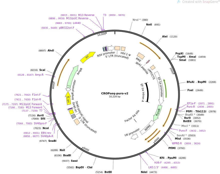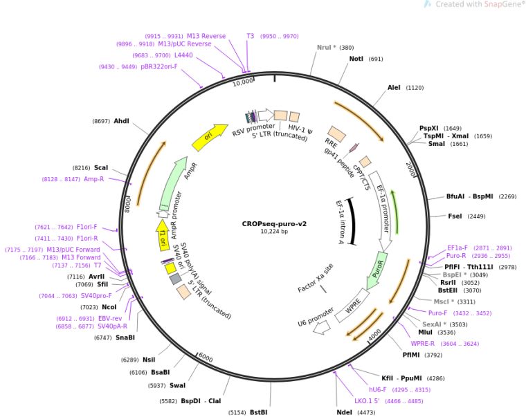 质粒名称:CROPseq-puro-v2 质粒编号:127458 质粒备注: (Empty Backbone) Entry plasmid for guide cloning 载体名称:pLenti (Addgene #86708) 载体类型:哺乳动物表达,慢病毒,CRISPR 筛选标记:嘌呤霉素 原核抗性:氨苄青霉素,100μg/mL 培养温度:37℃ 克隆菌株:NEB Stable 高拷贝/低拷贝:高拷贝 启动子:EF1a 克隆方法:未知 5'测序引物:tcttgtggaaaggacgaaaca 3'测序引物:aagcaccgactcggtgccac 质粒图谱: