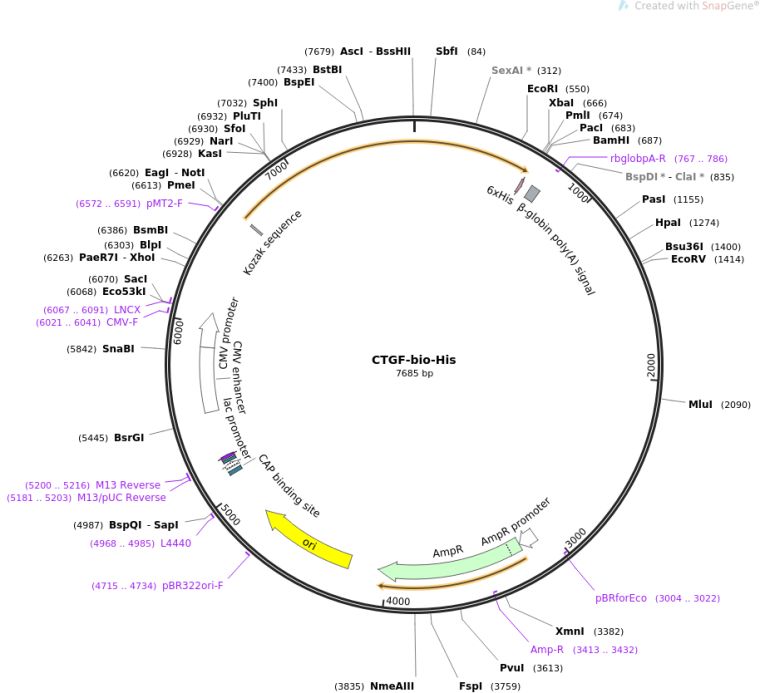 质粒名称:CTGF-bio-His 质粒编号:52028 质粒备注: Expresses full-length Connective tissue growth factor precursor ectodomain in mammalian cells. C-terminal rat Cd4d3+4 tag, biotinylation sequence and His tag. 载体名称:pTT3 载体大小:6618 完整质粒大小:7685 载体类型:哺乳动物表达 原核抗性:氨苄青霉素,100μg/mL 培养温度:37℃ 克隆菌株:Top10 高拷贝/低拷贝:高拷贝 插入基因:CTGF 基因别名:Connective tissue growth factor precursor 物种来源:H. sapiens (human) 插入大小:1067 基因名称:CCN2 (a.k.a. CTGF, HCS24, IBP-8, IGFBP8, NOV2) 启动子:CMV 标签/融合蛋白:· rat CD4 d3+4 (C terminal on backbone) · enzymatic biotinylation sequence (C terminal on backbone) · His tag (C terminal on backbone) 克隆方法:限制性内切酶 5'克隆位点:NotI (not destroyed) 3'克隆位点:AscI (not destroyed) 5'测序引物:CMV-fwd 质粒图谱: