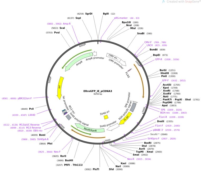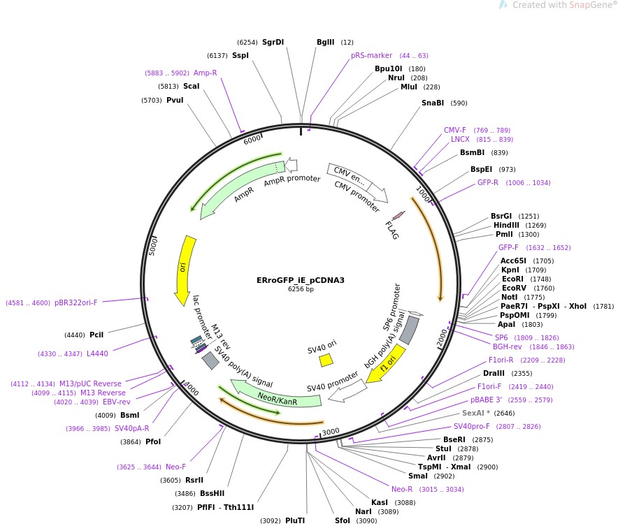质粒名称:ERroGFP_iE_pCDNA3 质粒编号:47954 质粒备注: Mammalian expression vector encoding for the ER targeted and FLAGM1 tagged redox probe roGFPiE (roGFP C147, E147b, C204) 载体名称:pcDNA3 derivative 载体大小:5370 完整质粒大小:6256 载体类型:哺乳动物表达 原核抗性:氨苄青霉素,100μg/mL 培养温度:37℃ 克隆菌株:DH5alpha 高拷贝/低拷贝:高拷贝 插入基因:ERroGFP 物种来源:jellyfish 基因突变:insertion E147B 插入大小:886 克隆方法:限制性内切酶 5'克隆位点:BamH1 (unknown if destroyed) 3'克隆位点:XhoI (unknown if destroyed) 5'测序引物:CMV forward 3'测序引物:SP6 质粒图谱:
