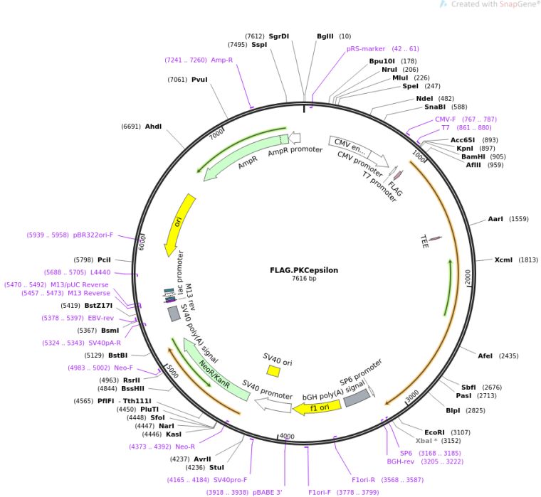 质粒名称:FLAG.PKCepsilon 质粒编号:10795 载体名称:pcDNA3 载体大小:5446 载体类型:哺乳动物表达 筛选标记:新霉素(G418) 原核抗性:氨苄青霉素,100μg/mL 培养温度:37℃ 克隆菌株:DH5alpha 高拷贝/低拷贝:高拷贝 插入基因:PKC epsilon 物种来源:H. sapiens (human) 插入大小:2100 基因名称:PRKCE (a.k.a. PKCE, nPKC-epsilon) 克隆方法:限制性内切酶 5'克隆位点:BamHI (not destroyed) 3'克隆位点:XbaI (not destroyed) 5'测序引物:T7 质粒图谱: