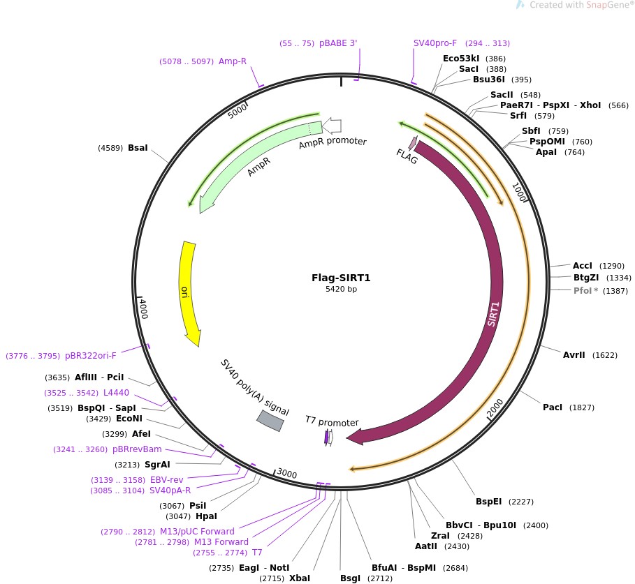 质粒名称:Flag-SIRT1 质粒编号:1791 质粒备注: Mammalian expression of flag-tagged SIRT1 载体名称:pECE 载体大小:2877 载体类型:哺乳动物表达 原核抗性:氨苄青霉素,100μg/mL 培养温度:37℃ 克隆菌株:DH5alpha 高拷贝/低拷贝:高拷贝 插入基因:SIRT1 基因别名:Sir2 物种来源:H. sapiens (human) 插入大小:2314 基因名称:SIRT1 (a.k.a. SIR2, SIR2L1, SIR2alpha) 克隆方法:限制性内切酶 5'克隆位点:HindIII (not destroyed) 3'克隆位点:XbaI (not destroyed) 5'测序引物:SV40pro-F 质粒图谱: