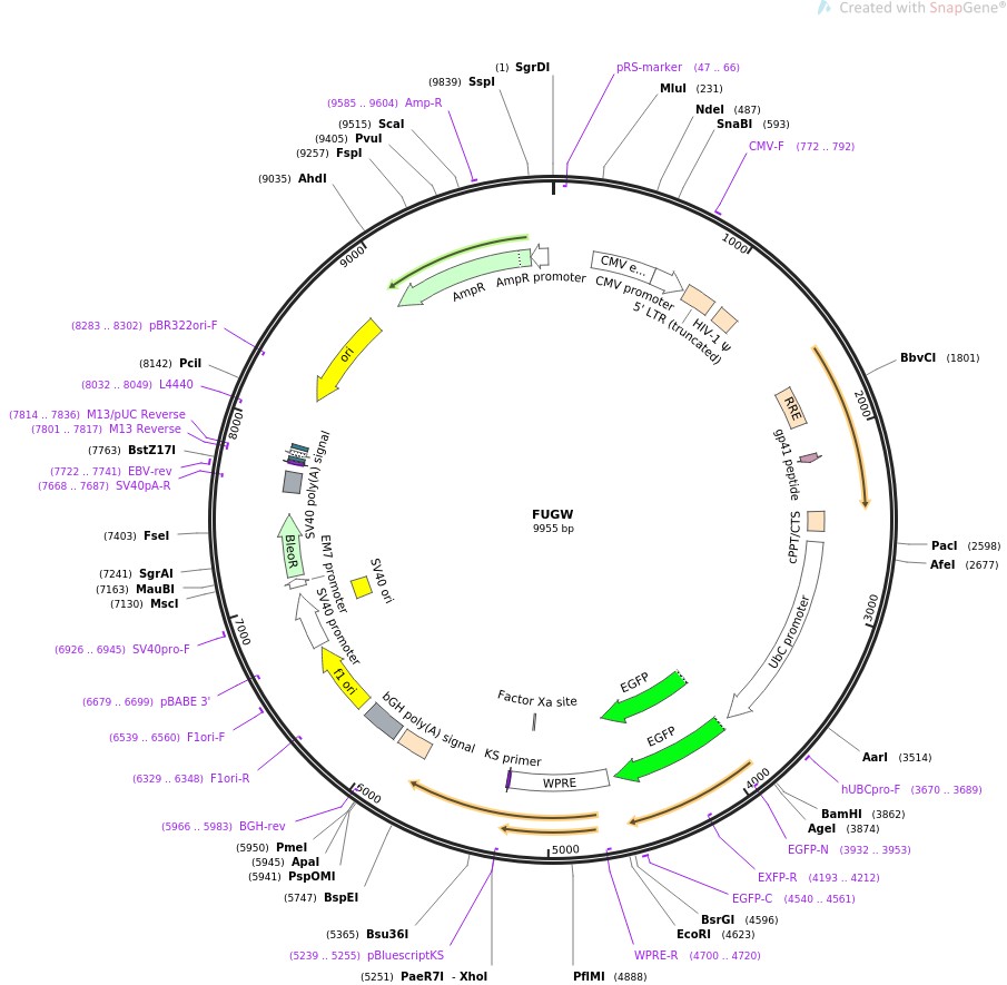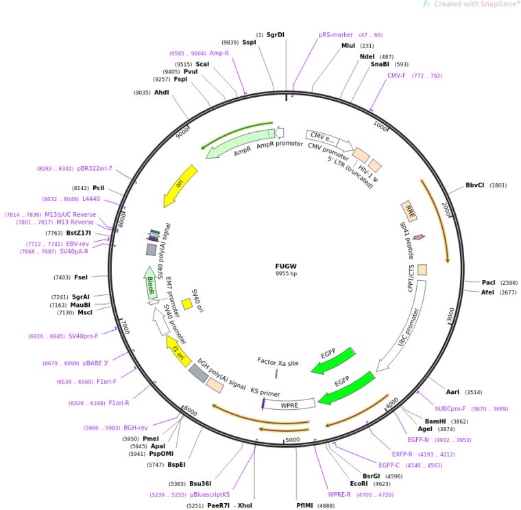 质粒名称:FUGW 质粒编号:14883 质粒备注: 3rd gen lentiviral plasmid with hUbC-driven EGFP; can be used for cDNA expresion 载体名称:HR'CS-G 载体类型:哺乳动物表达,慢病毒 原核抗性:氨苄青霉素,100μg/mL 培养温度:37℃ 克隆菌株:Stbl3 高拷贝/低拷贝:高拷贝 插入基因:flap-Ub promoter-GFP-WRE 克隆方法:限制性内切酶 5'测序引物:na 质粒图谱: