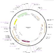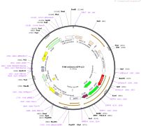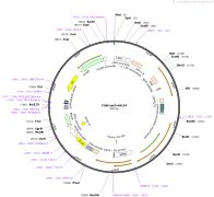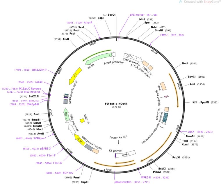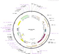 质粒名称:FU-tet-o-hOct4 质粒编号:19778 载体名称:FUdeltaGW 载体大小:8400 载体类型:哺乳动物表达,慢病毒 原核抗性:氨苄青霉素,100μg/mL 培养温度:37℃ 克隆菌株:Stbl3 高拷贝/低拷贝:高拷贝 插入基因:Oct4 物种来源:H. sapiens (human) 插入大小:1100 基因名称:POU5F1 (a.k.a. OCT3, OCT4, OTF-3, OTF3, OTF4, Oct-3, Oct-4, Oct3/4) 克隆方法:限制性内切酶 5'克隆位点:EcoRI (unknown if destroyed) 3'克隆位点:EcoRI (unknown if destroyed) 5'测序引物:CMV-F 质粒图谱:
