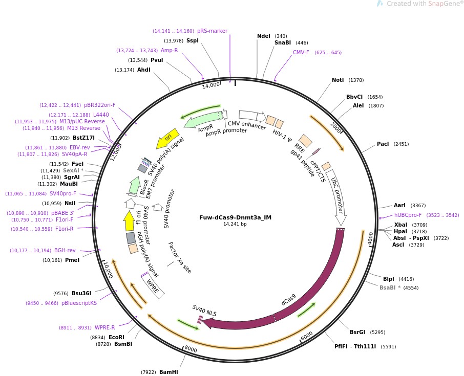 质粒名称:Fuw-dCas9-Dnmt3a_IM 质粒编号:84478 质粒备注: Lentiviral construct to express dCas9 fused with an inactive Dnmt3a catalytic domain (E664A, E756A) 载体名称:FUW 载体大小:9207 完整质粒大小:14313 载体类型:哺乳动物表达,慢病毒 筛选标记:Zeocin ; Resistance marker is outside the LTRs and will not be packaged into virus 原核抗性:氨苄青霉素,100μg/mL 培养温度:37℃ 克隆菌株:NEB Stable 高拷贝/低拷贝:高拷贝 插入基因:dCas9-Dnmt3a_IM 物种来源:H. sapiens (human), Synthetic 插入大小:5106 克隆方法:限制性内切酶 5'克隆位点:AscI (not destroyed) 3'克隆位点:EcoRI (not destroyed) 5'测序引物:aactatgcgctcggg 3'测序引物:taaagcagcgtatcc 质粒图谱: