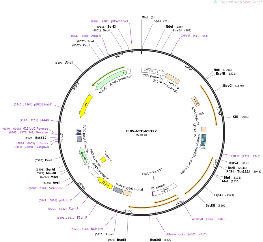 质粒名称:FUW-tetO-hSOX2 质粒编号:20724 载体名称:FUW 载体大小:8382 载体类型:哺乳动物表达,慢病毒 原核抗性:氨苄青霉素,100μg/mL 培养温度:37℃ 克隆菌株:Stbl3 高拷贝/低拷贝:高拷贝 插入基因:SOX2 物种来源:H. sapiens (human) 插入大小:966 基因名称:SOX2 (a.k.a. ANOP3, MCOPS3) 克隆方法:限制性内切酶 5'克隆位点:EcoRI (not destroyed) 3'克隆位点:EcoRI (not destroyed) 5'测序引物:LNCX 质粒图谱: