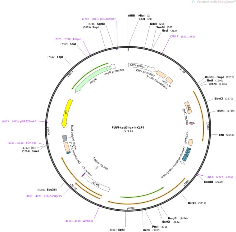 质粒名称:FUW-tetO-lox-hKLF4 质粒编号:20727 载体名称:FUW 载体大小:6454 载体类型:哺乳动物表达,慢病毒 原核抗性:氨苄青霉素,100μg/mL 培养温度:37℃ 克隆菌株:Stbl3 高拷贝/低拷贝:高拷贝 插入基因:KLF4 物种来源:H. sapiens (human) 插入大小:1522 基因名称:KLF4 (a.k.a. EZF, GKLF) 克隆方法:限制性内切酶 5'克隆位点:EcoRI (not destroyed) 3'克隆位点:EcoRI (not destroyed) 5'测序引物:LNCX 质粒图谱: