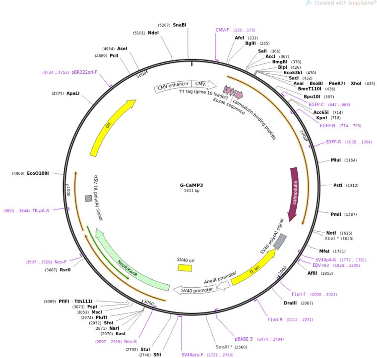 质粒名称:G-CaMP3 质粒编号:22692 质粒备注: a single-wavelength GCaMP2-based genetically encoded calcium indicator 载体名称:pEGFP-N1 载体大小:4000 载体类型:哺乳动物表达 原核抗性:卡那霉素,50μg/mL 培养温度:37℃ 克隆菌株:DH5alpha 高拷贝/低拷贝:未知 插入基因:G-CaMP3 基因别名:GCaMP3 基因突变:N363D mutation (increased fluorescence) 插入大小:1300 克隆方法:限制性内切酶 5'克隆位点:BglII (unknown if destroyed) 3'克隆位点:NotI (unknown if destroyed) 5'测序引物:EGFP-N 质粒图谱: