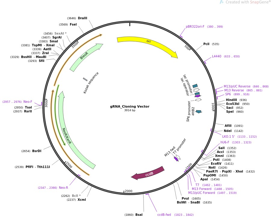 质粒名称:gRNA_Cloning Vector 质粒编号:41824 质粒备注: (Empty Backbone) An empty gRNA expression vector, used to create a gRNA to a specific sequence. 载体名称:pCR-Blunt II-TOPO 载体类型:哺乳动物表达,CRISPR 原核抗性:卡那霉素,50μg/mL 培养温度:37℃ 克隆菌株:Top10 高拷贝/低拷贝:未知 克隆方法:TOPO Cloning 5'测序引物:T7 质粒图谱: