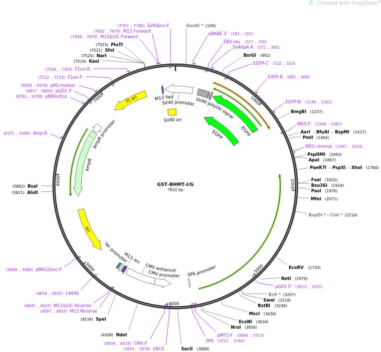 质粒名称:GST-BHMT-I/G 质粒编号:104442 质粒备注: Autophagy cargo assay 载体名称:pRK5 载体大小:4754 完整质粒大小:7832 载体类型:哺乳动物表达 原核抗性:氨苄青霉素,100μg/mL 培养温度:37℃ 克隆菌株:DH5alpha 高拷贝/低拷贝:高拷贝 插入基因:BHMT 物种来源:H. sapiens (human) 基因突变:N43A in GST (in a potential KFERQ-like sequence). BHMT does not contain the first 8 or last 9 amino acids. 插入大小:3213 基因名称:BHMT (a.k.a. BHMT1, HEL-S-61p) 启动子:CMV 标签/融合蛋白:· GST (N terminal on insert) · GFP-myc GFP is from Aequorea victoria (C terminal on insert) 克隆方法:限制性内切酶 5'克隆位点:Nru1 (unknown if destroyed) 3'克隆位点:HindIII (unknown if destroyed) 5'测序引物:SP6 5'-TGATGAGTTTGGACAAACCAC-3' 质粒图谱: