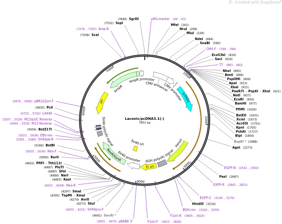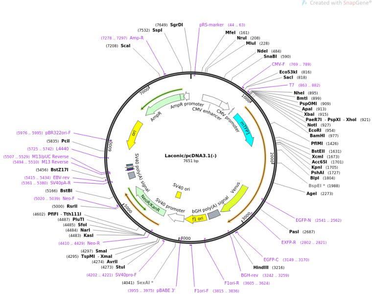 质粒名称:Laconic/pcDNA3.1(-) 质粒编号:44238 质粒备注: a genetically-encoded sensor for lactate concentration, transport and metabolic flux 载体名称:pcDNA3.1(-) 载体大小:5418 完整质粒大小:7648 载体类型:Mammalian Expression ; lactate biosensor 筛选标记:新霉素(G418) 原核抗性:氨苄青霉素,100μg/mL 培养温度:37℃ 克隆菌株:DH5alpha 高拷贝/低拷贝:高拷贝 插入基因:Laconic (LACtate Optical Nano Indicator from CECs) 物种来源:Synthetic 插入大小:2230 启动子:CMV 克隆方法:限制性内切酶 5'克隆位点:BamHI (unknown if destroyed) 3'克隆位点:HindIII (unknown if destroyed) 5'测序引物:CMV-F 3'测序引物:BGH-rev 质粒图谱: