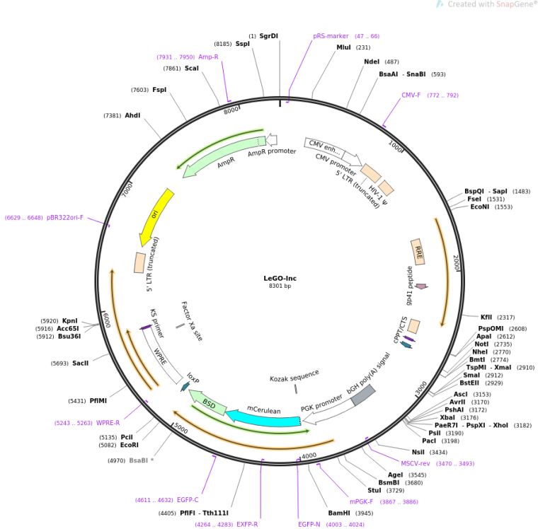 质粒名称:LeGO-lnc 质粒编号:80624 质粒备注: Lentiviral lncRNA Overexpression 载体名称:LeGO-Cer 载体大小:8300 完整质粒大小:8300 载体类型:慢病毒 筛选标记:Blasticidin ; mCerulean 原核抗性:氨苄青霉素,100μg/mL 培养温度:37℃ 克隆菌株:NEB Stable 高拷贝/低拷贝:高拷贝 插入基因:empty control 启动子:SFFV 克隆方法:限制性内切酶 5'克隆位点:SgsI (unknown if destroyed) 3'克隆位点:PacI (unknown if destroyed) 5'测序引物:GAGCTCACAACCCCTCACTC 质粒图谱: