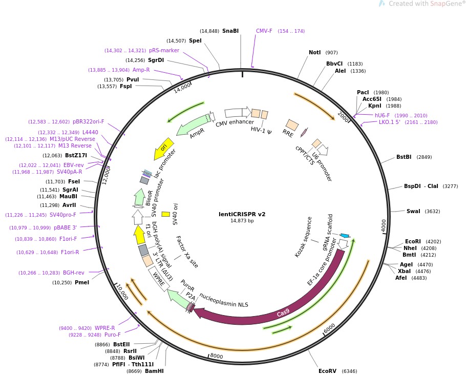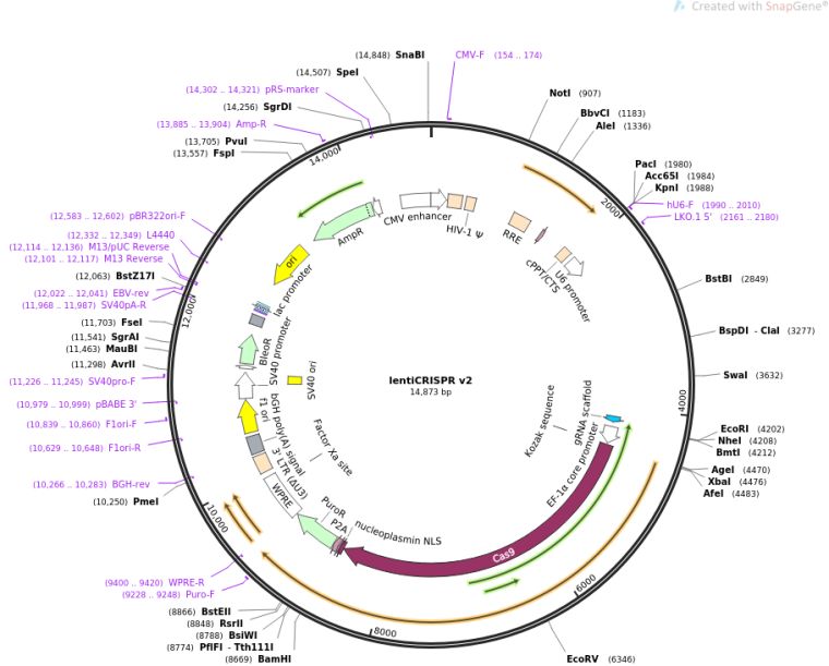 质粒名称:lentiCRISPR v2 质粒编号:52961 质粒备注: Replaces original lentiCRISPRv1 (Addgene Plasmid 49535) and produces 10-fold higher titer virus. 3rd generation lentiviral backbone. 载体名称:Custom 载体大小:10000 完整质粒大小:14873 载体类型:哺乳动物表达,慢病毒,CRISPR 筛选标记:嘌呤霉素 原核抗性:氨苄青霉素,100μg/mL 培养温度:37℃ 克隆菌株:Stbl3 高拷贝/低拷贝:高拷贝 插入基因:Cas9 基因别名:S. pyogenes CRISPR-Cas9 物种来源:Synthetic 插入大小:4200 启动子:EFS-NS 克隆方法:限制性内切酶 5'克隆位点:AgeI, XbaI, AfeI (not destroyed) 3'克隆位点:BamHI (not destroyed) 5'测序引物:hEF1aprom-F 3'测序引物:WPRE-R 质粒图谱:
