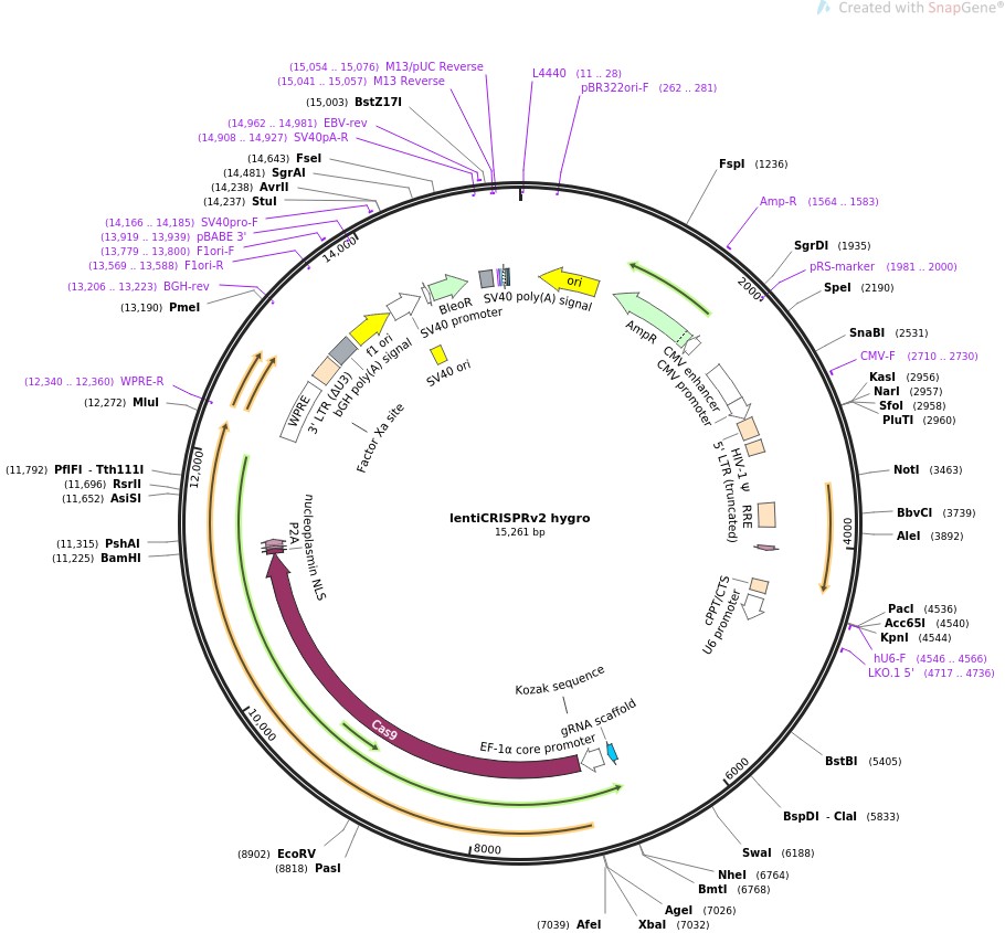 质粒名称:lentiCRISPRv2 hygro 质粒编号:98291 质粒备注: (Empty Backbone) Variant of lentiCRISPRv2 that confers hygromycin resistance 载体名称:lentiCRISPRv2 载体大小:15261 载体类型:Lentiviral, CRISPR 筛选标记:潮霉素 原核抗性:氨苄青霉素,100μg/mL 培养温度:37℃ 克隆菌株:NEB Stable 高拷贝/低拷贝:高拷贝 插入基因:P2A-hygro 启动子:EF-1a 克隆方法:限制性内切酶 5'克隆位点:BamHI (not destroyed) 3'克隆位点:MluI (not destroyed) 5'测序引物:CCAAAGAGGTGCTGGACG 3'测序引物:WPRE-R (CATAGCGTAAAAGGAGCAACA) 质粒图谱: