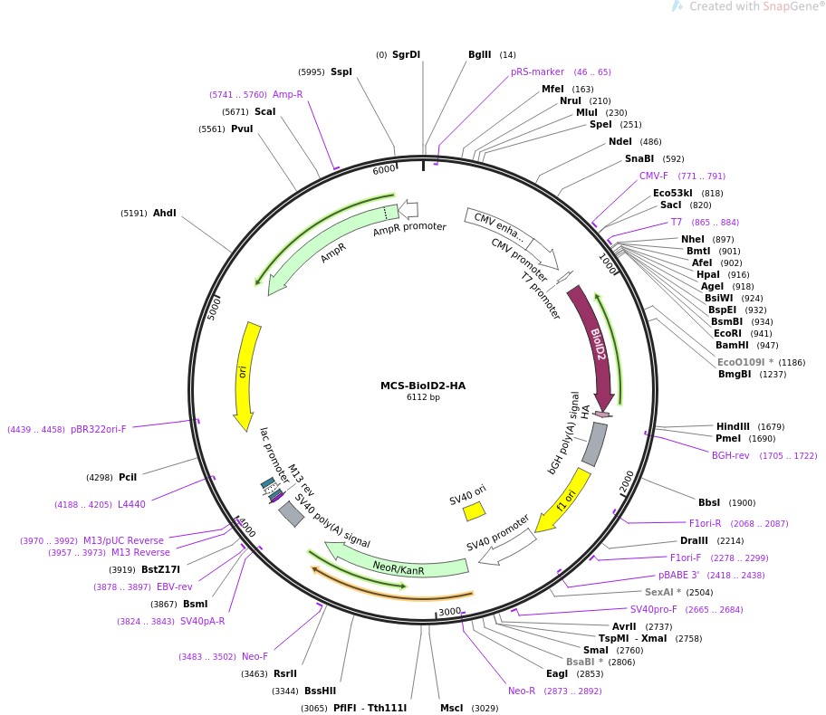 质粒名称:MCS-BioID2-HA 质粒编号:74224 质粒备注: (Empty Backbone) To fuse your protein of interest to the N-terminus of BioID2 and use in proximity-dependent biotin identification (BioID); MCS is present upstream of BioID2 tag and HA tag 载体名称:pcDNA 3.1 载体大小:6113 载体类型:哺乳动物表达 筛选标记:新霉素(G418) 原核抗性:氨苄青霉素,100μg/mL 培养温度:37℃ 克隆菌株:DH5alpha 高拷贝/低拷贝:未知 启动子:CMV 标签/融合蛋白:· humanized A. aeolicus BioID2 with R40G (C terminal on backbone) · HA (C terminal on backbone) 克隆方法:限制性内切酶 5'测序引物:CMV-F 3'测序引物:BGH-rev 质粒图谱: