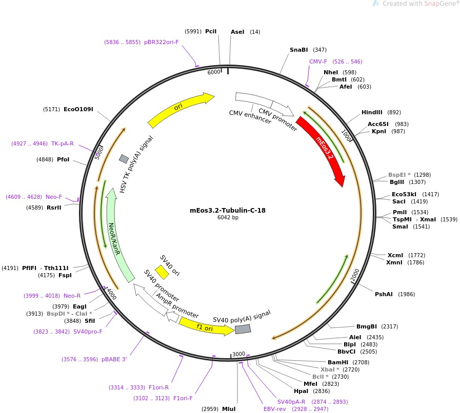 质粒名称:mEos3.2-Tubulin-C-18 质粒编号:57484 质粒备注: Localization: Microtubules, Excitation: 507 / 572, Emission: 516 / 580 载体名称:mEos3.2-C1 载体大小:4750 载体类型:哺乳动物表达 筛选标记:新霉素(G418) 原核抗性:卡那霉素,50μg/mL 培养温度:37℃ 克隆菌株:DH5alpha 高拷贝/低拷贝:高拷贝 插入基因:Tubulin 基因别名:NM_006082.2 物种来源:H. sapiens (human) 基因名称:TUBA1B (a.k.a. K-ALPHA-1) 启动子:CMV 克隆方法:未知 5'测序引物:CMV-F 3'测序引物:SV40pA-R 质粒图谱: