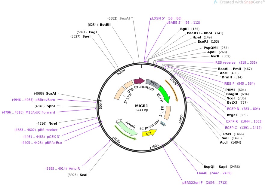 质粒名称:MIGR1 质粒编号:27490 质粒备注: (Empty Backbone) 载体名称:MSCV 载体大小:6200 载体类型:哺乳动物表达,逆转录 原核抗性:氨苄青霉素,100μg/mL 培养温度:37℃ 克隆菌株:DH5alpha 高拷贝/低拷贝:高拷贝 插入基因:None 标签/融合蛋白:· IRES (C terminal on insert) · GFP (C terminal on insert) 克隆方法:限制性内切酶 5'测序引物:pLXSN 5' 质粒图谱: