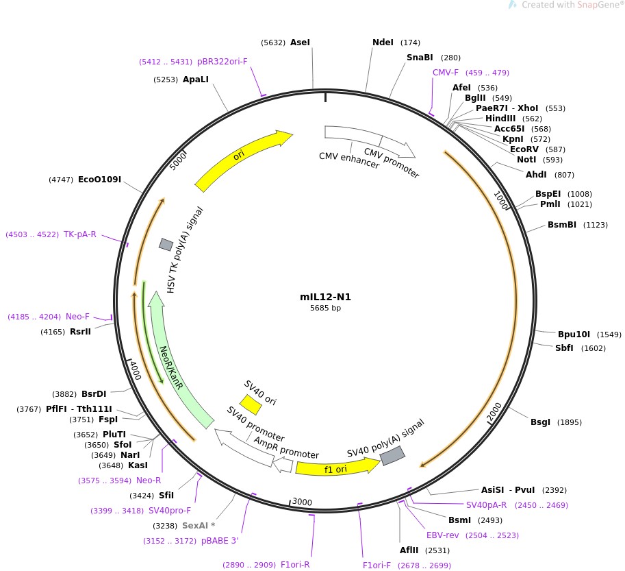 质粒名称:mIL12-N1 质粒编号:123139 质粒备注: Mammalian expression of murine cytokine IL-12 under CMV promoter 载体名称:N1 载体大小:4000 完整质粒大小:5685 载体类型:哺乳动物表达 筛选标记:新霉素(G418) 原核抗性:卡那霉素,50μg/mL 培养温度:37℃ 克隆菌株:DH5alpha 高拷贝/低拷贝:高拷贝 插入基因:Murine IL12 tandem p40 p35 基因别名:mIL-12 基因别名:p40 基因别名:p35 物种来源:M. musculus (mouse) 插入大小:1773 启动子:CMV 克隆方法:限制性内切酶 5'克隆位点:NotI (not destroyed) 3'克隆位点:PvuI (not destroyed) 5'测序引物:cgcaaatgggcggtaggcgtg 3'测序引物:GATGAGTTTGGACAAACCAC 质粒图谱: