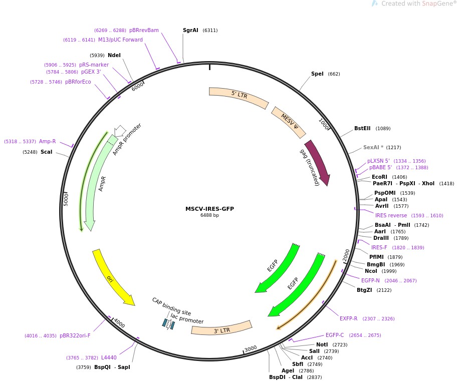 质粒名称:MSCV-IRES-GFP 质粒编号:20672 质粒备注: (Empty Backbone) 载体名称:MSCV 载体大小:6500 载体类型:哺乳动物表达,逆转录 原核抗性:氨苄青霉素,100μg/mL 培养温度:37℃ 克隆菌株:Stbl3 高拷贝/低拷贝:高拷贝 克隆方法:限制性内切酶 5'测序引物:pLXSN5; pBABE5 3'测序引物:pCDH-rev (GCATTCCTTTGGCGAGAG) 质粒图谱: