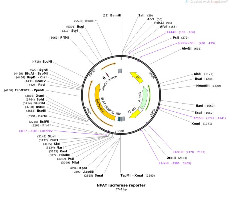 质粒名称:NFAT luciferase reporter 质粒编号:10959 载体名称:pGL2-Basic 载体类型:Mammalian Expression, Luciferase 原核抗性:氨苄青霉素,100μg/mL 培养温度:37℃ 克隆菌株:DH5alpha 高拷贝/低拷贝:高拷贝 插入基因:IL-2 promoter 基因别名:IL-2 物种来源:H. sapiens (human) 插入大小:90 基因名称:IL2 (a.k.a. IL-2, TCGF, lymphokine) 克隆方法:限制性内切酶 5'测序引物:LucNRev 质粒图谱: