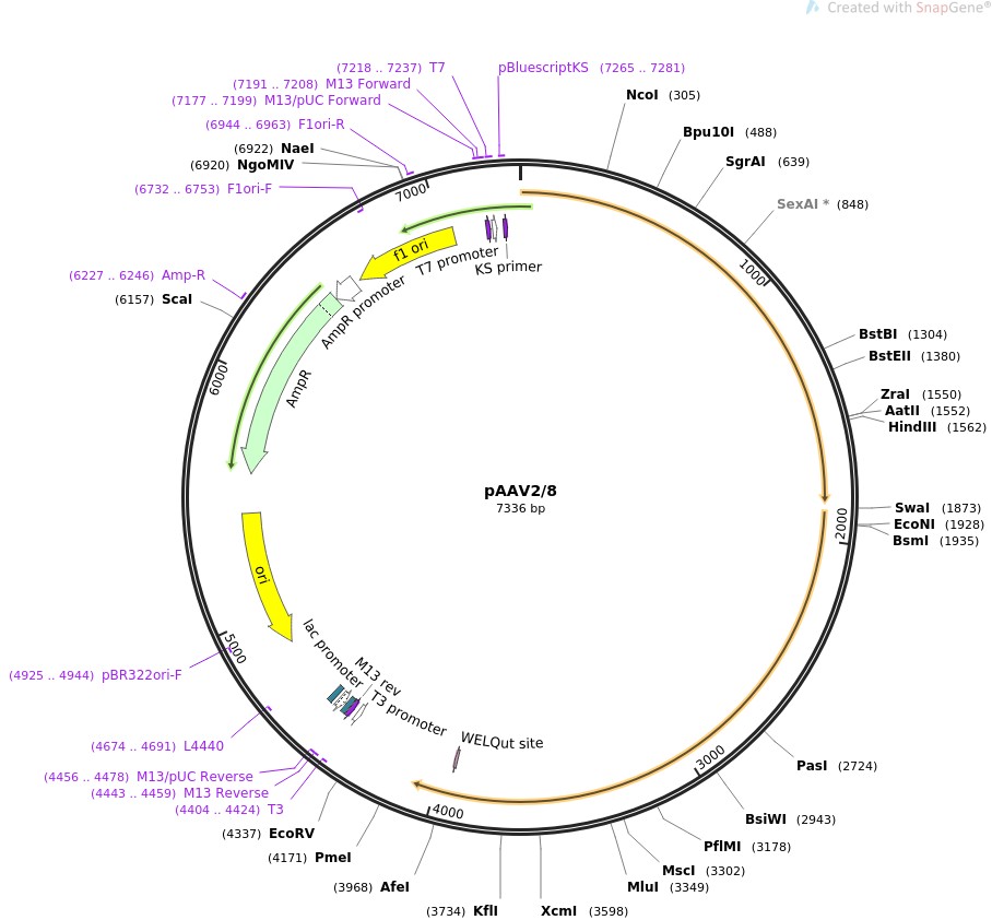 质粒名称:pAAV2/8 质粒编号:112864 质粒备注: AAV packaging plasmid expressing Rep/Cap genes 载体名称:unknown 载体类型:AAV 原核抗性:氨苄青霉素,100μg/mL 培养温度:37℃ 克隆菌株:DH5alpha 高拷贝/低拷贝:未知 插入基因:Rep2/Cap8 物种来源:AAV 启动子:Truncated P5 克隆方法:未知 5'测序引物:KS primer 质粒图谱: