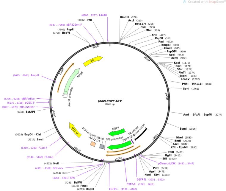 质粒名称:pAAV-fNPY-GFP 质粒编号:22912 载体名称:pAAV 载体大小:4000 载体类型:Mammalian Expression, AAV 原核抗性:氨苄青霉素,100μg/mL 培养温度:37℃ 克隆菌株:Stbl3 高拷贝/低拷贝:高拷贝 插入基因:fugu neuropeptide Y promoter driving GFP 物种来源:takifugu rubripes (fugu) 插入大小:4300 克隆方法:限制性内切酶 5'测序引物:Unknown 3'测序引物:SP6 质粒图谱: