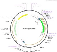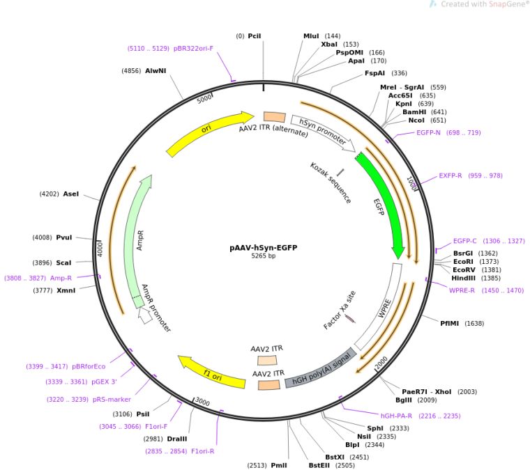 质粒名称:pAAV-hSyn-EGFP 质粒编号:50465 质粒备注: EGFP under the control of human synapsin promoter 载体名称:pAAV 载体大小:4818 完整质粒大小:5265 载体类型:AAV 原核抗性:氨苄青霉素,100μg/mL 培养温度:30℃ 克隆菌株:NEB Stable 高拷贝/低拷贝:低拷贝 插入基因:EGFP 物种来源:Aequorea victoria 插入大小:726 启动子:human Synapsin 1 克隆方法:限制性内切酶 5'克隆位点:BamH I (not destroyed) 3'克隆位点:EcoR I (not destroyed) 5'测序引物:TCGTGTCGTGCCTGAGAGCG 3'测序引物:GCATTAAAGCAGCGTATCCACATAGC 质粒图谱: