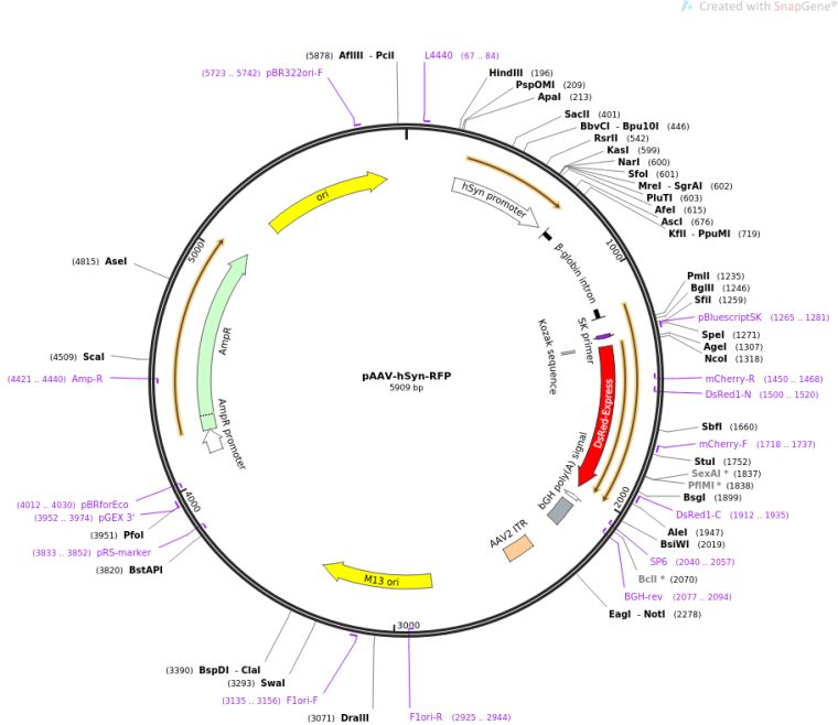 质粒名称:pAAV-hSyn-RFP 质粒编号:22907 载体名称:pAAV 载体大小:4100 载体类型:Mammalian Expression, AAV ; Adeno-associated virus 原核抗性:氨苄青霉素,100μg/mL 培养温度:37℃ 克隆菌株:NEB Stable 高拷贝/低拷贝:高拷贝 插入基因:human Synapsin I promoter driving DsRedExpress 基因别名:Syn1 物种来源:H. sapiens (human) 插入大小:2100 基因名称:SYN1 (a.k.a. EPILX, MRX50, SYN1a, SYN1b, SYNI) 克隆方法:限制性内切酶 5'测序引物:Unknown 3'测序引物:SP6 质粒图谱: