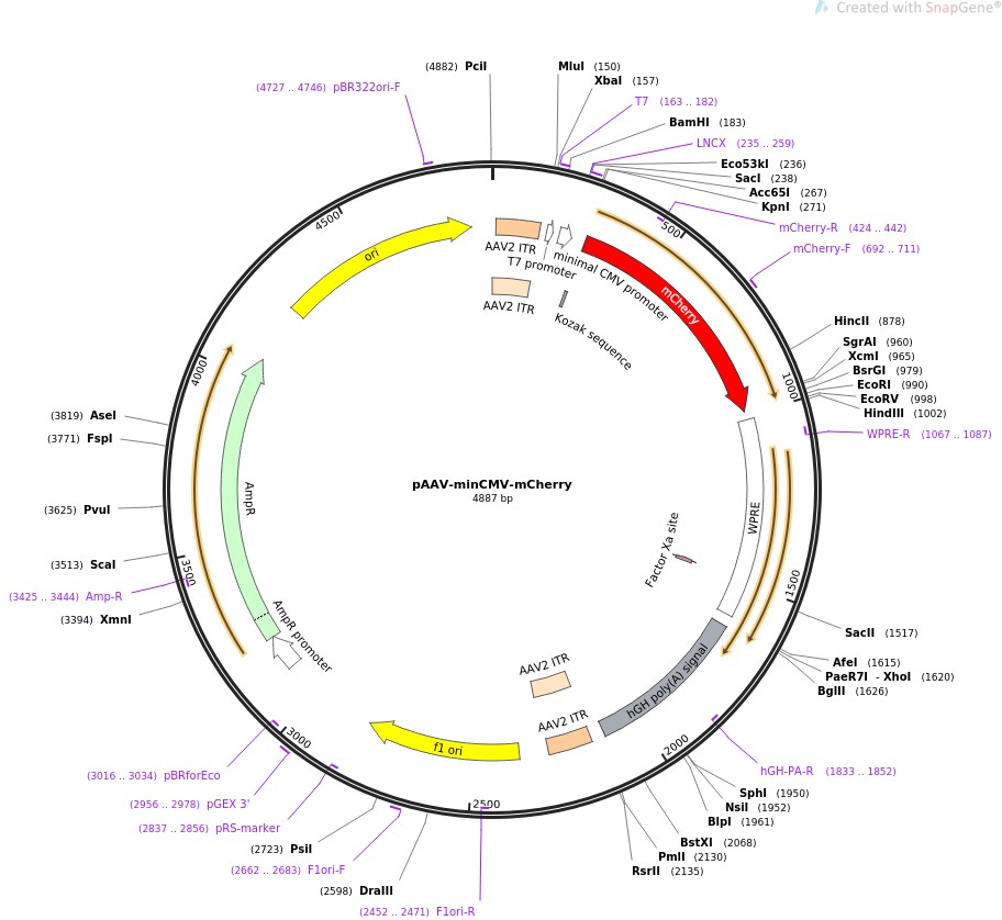 质粒名称:pAAV-minCMV-mCherry 质粒编号:27970 载体名称:pAAV 载体大小:4154 载体类型:Mammalian Expression, AAV 原核抗性:氨苄青霉素,100μg/mL 培养温度:37℃ 克隆菌株:NEB Stable 高拷贝/低拷贝:高拷贝 插入基因:mCherry 物种来源:Synthetic 插入大小:711 克隆方法:限制性内切酶 5'克隆位点:MluI (not destroyed) 3'克隆位点:EcoRI (not destroyed) 5'测序引物:ccgagggcttcaagtgggagcgc 3'测序引物:cagcttcaccttgtagatgaactcgc 质粒图谱: