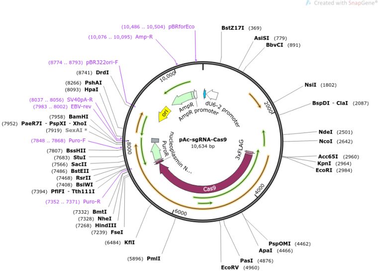 质粒名称:pAc-sgRNA-Cas9 质粒编号:49330 质粒备注: Expresses sgRNA and Cas9-Puro in Drosophila S2 cells 载体名称:pAc-STABLE1-Puro 载体大小:6600 完整质粒大小:10658 载体类型:Insect Expression, CRISPR 筛选标记:嘌呤霉素 原核抗性:氨苄青霉素,100μg/mL 培养温度:37℃ 克隆菌株:DH5alpha 高拷贝/低拷贝:高拷贝 插入基因:Cas9 基因别名:CRISPR associated 9 基因别名:hspCas9 物种来源:Synthetic; Streptococcus pyogenes 基因突变:Human codon optimised 插入大小:4278 启动子:Actin-5c 标签/融合蛋白:· 3xFLAG (N terminal on insert) · NLS (N terminal on insert) · NLS (C terminal on insert) 克隆方法:限制性内切酶 5'克隆位点:EcoRI (not destroyed) 3'克隆位点:HindIII (not destroyed) 5'测序引物:gagttcttgtgctgtgtgga 3'测序引物:tcgagacaaacggcgaaacc 质粒图谱: