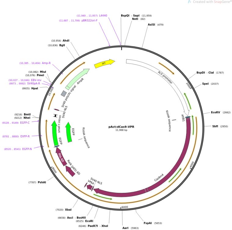 质粒名称:pAct:dCas9-VPR 质粒编号:78898 质粒备注: Expresses dCas9-VPR under Actin promoter for CRISPRa in Drosophila cell culture. Please note- this plasmid does not express GFP. 载体名称:pAWG 载体类型:Insect Expression, CRISPR 原核抗性:氨苄青霉素,100μg/mL 培养温度:37℃ 克隆菌株:DH5alpha 高拷贝/低拷贝:未知 插入基因:dCas9-VPR 插入大小:5733 启动子:pActin (Drosophila) 克隆方法:Gibson Cloning 5'测序引物:TTTGAACGCGACTTGAGAGC 质粒图谱: