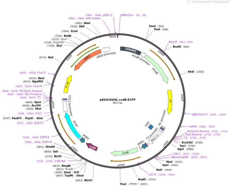 质粒名称:pAG416GAL-ccdB-ECFP 质粒编号:14171 质粒备注: (Empty Backbone) 载体名称:pRS416 载体类型:酵母表达; Gateway Destination 筛选标记:URA3 原核抗性:Chloramphenicol and Ampicillin, 25 & 100 μg/mL 培养温度:37℃ 克隆菌株:ccdB Survival 高拷贝/低拷贝:未知 插入基因:None 克隆方法:Gateway Cloning 5'测序引物:GAL1 质粒图谱:
