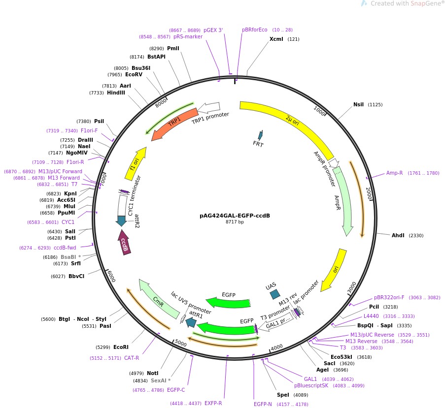 质粒名称:pAG424GAL-EGFP-ccdB 质粒编号:14319 质粒备注: (Empty Backbone) 载体名称:pRS424 载体类型:酵母表达; Gateway Destination 筛选标记:TRP1 原核抗性:Chloramphenicol and Ampicillin, 25 & 100 μg/mL 培养温度:37℃ 克隆菌株:ccdB Survival 高拷贝/低拷贝:未知 插入基因:None 克隆方法:Gateway Cloning 5'测序引物:EGFP-C 质粒图谱: