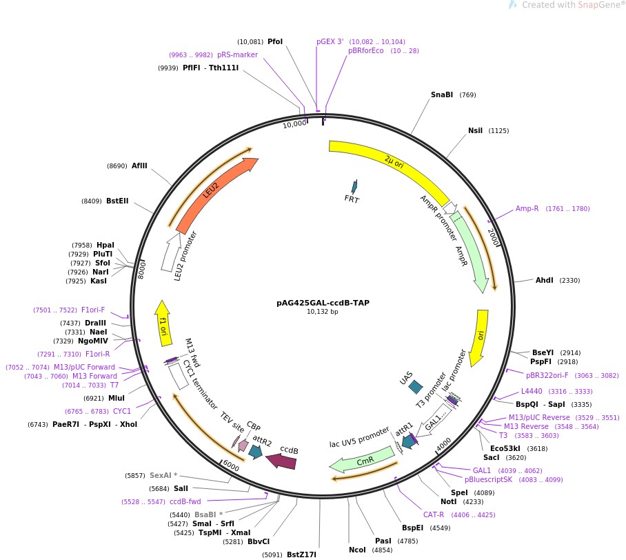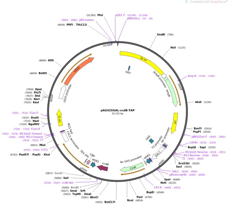 质粒名称:pAG425GAL-ccdB-TAP 质粒编号:14273 质粒备注: (Empty Backbone) 载体名称:pRS425 载体类型:酵母表达; Gateway Destination 筛选标记:LEU2 原核抗性:Chloramphenicol and Ampicillin, 25 & 100 μg/mL 培养温度:37℃ 克隆菌株:ccdB Survival 高拷贝/低拷贝:未知 插入基因:None 克隆方法:Gateway Cloning 5'测序引物:GAL1 质粒图谱:
