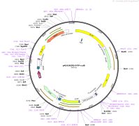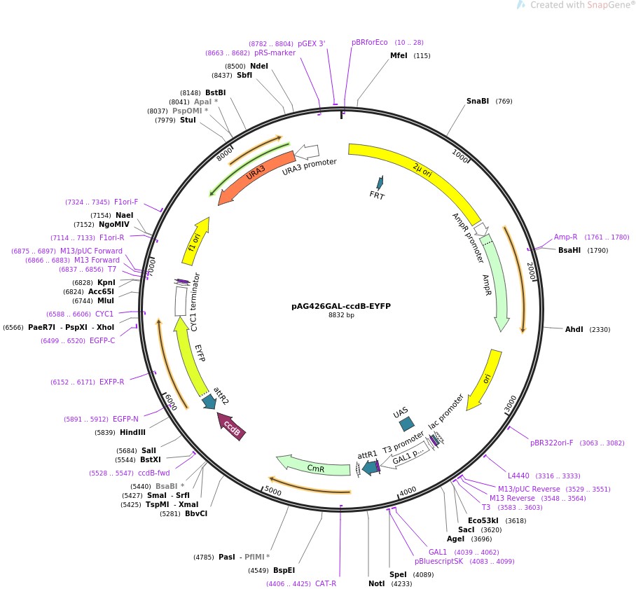 质粒名称:pAG426GAL-ccdB-EYFP 质粒编号:14227 质粒备注: (Empty Backbone) 载体名称:pRS426 载体类型:酵母表达; Gateway Destination 筛选标记:URA3 原核抗性:Chloramphenicol and Ampicillin, 25 & 100 μg/mL 培养温度:37℃ 克隆菌株:ccdB Survival 高拷贝/低拷贝:未知 插入基因:None 克隆方法:Gateway Cloning 5'测序引物:GAL1 质粒图谱: