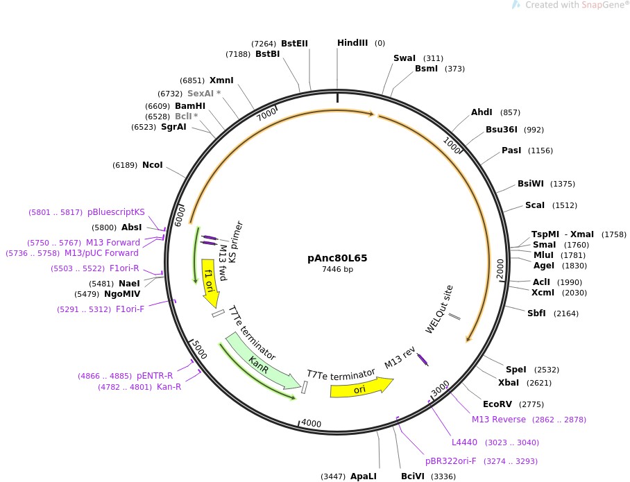 质粒名称:pAnc80L65 质粒编号:68837 质粒备注: Adeno-associated Viral Vector (AAV) capsid Anc80L65 in AAV2Rep expression construct. Note that an improved version is available: Addgene plasmid# 92307. See comments for details 载体名称:synthetic 载体大小:5238 完整质粒大小:7446 载体类型:Mammalian Expression, AAV, Synthetic Biology 原核抗性:卡那霉素,50μg/mL 培养温度:37℃ 克隆菌株:Stbl2 高拷贝/低拷贝:高拷贝 插入基因:Ancestral AAV Capsid Anc80L65 基因别名:ANC80L65 物种来源:Synthetic 插入大小:2208 启动子:Rep2 克隆方法:未知 5'测序引物:M13rev 质粒图谱: