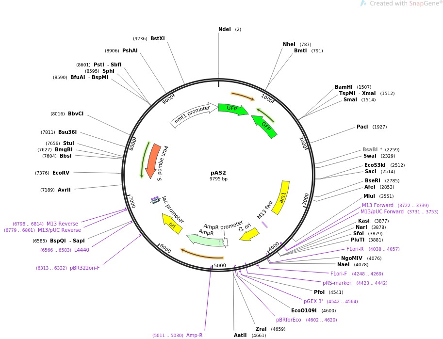 质粒名称:pAS2 质粒编号:12389 载体名称:pREP2 载体大小:8290 载体类型:酵母表达 筛选标记:ura4 原核抗性:氨苄青霉素,100μg/mL 培养温度:37℃ 克隆菌株:DH5alpha 高拷贝/低拷贝:高拷贝 插入基因:green fluorescent protein 基因别名:GFP 物种来源:Aequorea victoria 插入大小:1500 克隆方法:限制性内切酶 5'克隆位点:NdeI (not destroyed) 3'克隆位点:BamHI (not destroyed) 5'测序引物:n/a 3'测序引物:n/a 质粒图谱: